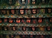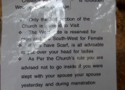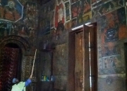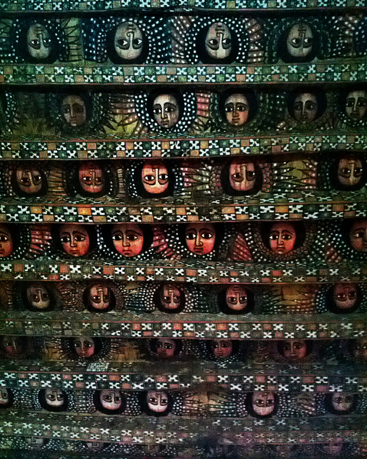Nachdem wir die Royal Enclosure besucht und Verbandszeug für den Knöchel aufgetrieben hatten, schauten wir uns am frühen Abend noch die Kirche Debre Birhan Selassie an, die berühmt für ihre Innendekoration ist. Die meisten orthodoxen Kirchen hier sind reich mit Bildern biblischer Szenen verziert, meist in einem sehr „naiv“ wirkenden Mal-Stil. Wie schon erwähnt, dürfen Frauen manche Kirchen überhaupt nicht betreten, hier gab es spezielle Eingänge für Männlein/Weiblein, zudem war draußen auf einem Schild zu lesen, daß Frauen während der Menstruation vom Betreten Abstand nehmen sollte und ebenso Frauen und Männer, die am Tag zuvor Sex hatten. Die Religion, immer auf Höhe der Zeit….