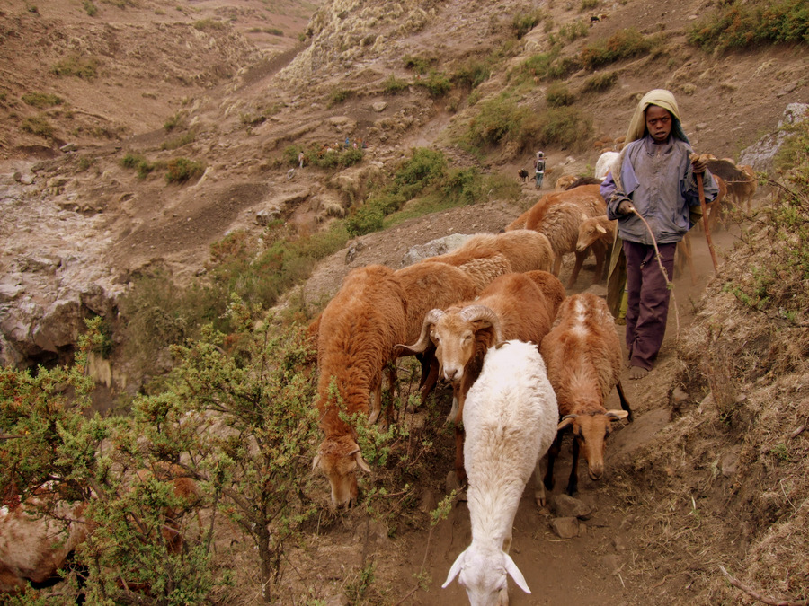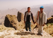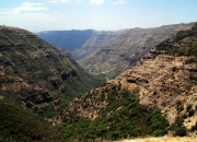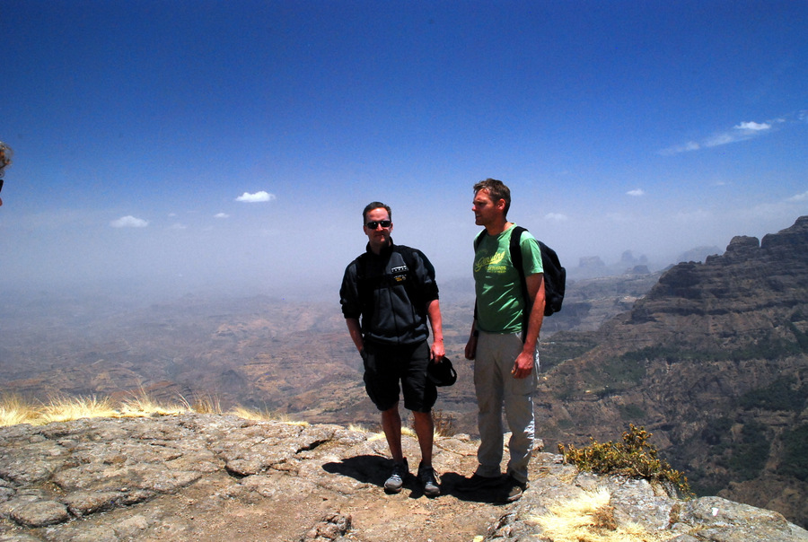 Die Simien Mountains sind, wie gesagt, ein Tafelgebirge mit Höhen zwischen 2.600m bis 4.600m. Man starten den üblichen 3-Tagetrek mit einer kurzen Busfahrt, auf der es Dutzende der Dschellada Paviane zu sehen gab (die sich aber später nicht mehr blicken ließen) bis an den Rand des „Kliffs“, wo das Gepäck von Muli-Treibern übernommen und ins angepeilte Camp gebracht wird. Die Treiber nehmen hierfür die Straße, die teilweise parallel in einigem Abstand zum Trekking-Pfad verläuft. Man wandert dann einige Stunden entlang der „Tafelberg-Kante“ und hat phantastische Ausblicke in das knapp 1000m-1500m tiefer gelegene Hügelland. Anschließend biegt man in ein sehr weites Hochtal nach Osten ab zum Geech Camp. Die Landschaft in den Simien-Bergen ist schon sehr speziell, eine ähnliche Gebirgslandschaft hab ich zumindest noch nirgendwo sonst gesehen.