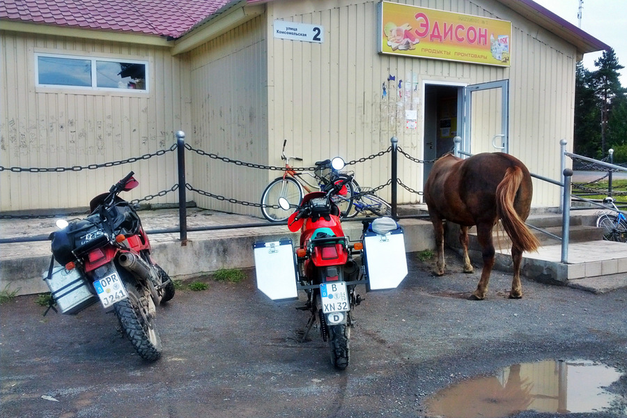 Der nächste Tag begann großartig! Nach dem Regen in der Nacht hatten wir strahlenden Sonnenschein in unserem Camp am See, Götz nutzte gleich die Gelegenheit zum Baden, während ich den Kaffee in unserer Espressina aufsetzte. Nach dem Aufrödeln der Bikes ging es über kleine Landstraßen weiter Richtung Norden, das heutige Ziel war eigentlich die Stadt Kem am Weissen Meer (aber das sollte ganz anders kommen…). Obwohl wir uns direkt hinter dem Camp verfahren hatten (einmal beim ersten Abbiegen bei der Himmelsrichtung gepennt) machte das Cruisen auf den verkehrsarmen Landstraßen mit ihren pittoresken Dörfern sehr viel Freude, immer wieder mal hielten wir an einem „Produkty“ bzw. „Magasin“, wie in Russland die Tante-Emma-Läden heißen, was auch jedesmal ein uriges Erlebnis war, denn das Betreten der meisten Läden glich einer Zeitreise. Meistens stammte das Mobiliar aus Sowjetzeiten und die Läden wirkten immer ein wenig provisorisch, so als seien die Räume ursprünglich gar nicht für einen Laden gedacht gewesen. Und wenn dann auch noch ein Pferd vor dem Laden parkte, war das Travellerglück vollkommen.