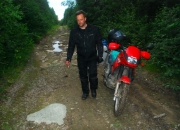 Mittlerweile war es dann (nach 0.00 Uhr) auch dunkel geworden, wir fuhren zu zweit auf meinem Motorrad bis kurz vor die Tanke in Medvezhgorsk und campten wild im Wald. Am nächsten Morgen bogen wir dann in die Unglückspiste ab, verstauten nach 3km meine Koffer an einer Waldschneise im Dickicht, weil dadurch die Maschine handlicher werden sollte. Dann fuhren wir 15km zu zweit über die immer schlimmer werdende Piste. Anfangs waren die riesigen Pfützen, an denen ich zur Sicherheit meistens abstieg, das größte Problem (wobei Götz die als Fahrer alle souverän meisterte).