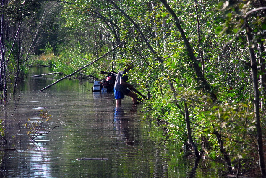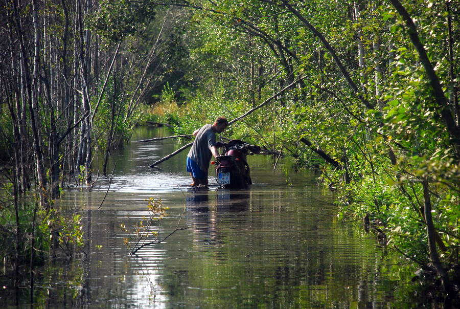 Götz zog seine Klamotten aus und stiefelte in den Sumpf, um zunächst mal das Gepäck zu bergen. Ich stand bereit, um ihm beim Schieben der Maschine zu helfen, aber er bekam sie allein ins Trockene. Zwischendrin kamen wir auf die Idee, den Sumpf, der anscheinend künstlich aufgestaut war, einfach abzulassen. Götz riss also an einer Stelle die Befestigung raus. Die nächsten 3 Stunden, die wir am Motorrad werkelten, hörten wir das Wasser rauschen, ohne daß der Sumpf aber erkennbar sank. Es war aber auch ein großer Sumpf. :-) Es flossen solche Wassermassen in den Wald, daß wir trotz der einsamen Lage später fast ein wenig nervös wurden, daß irgendwann ein paar russische Waldschrate auftauchen würden, um nachzusehen, wer hier ihre Gegend geflutet hat.