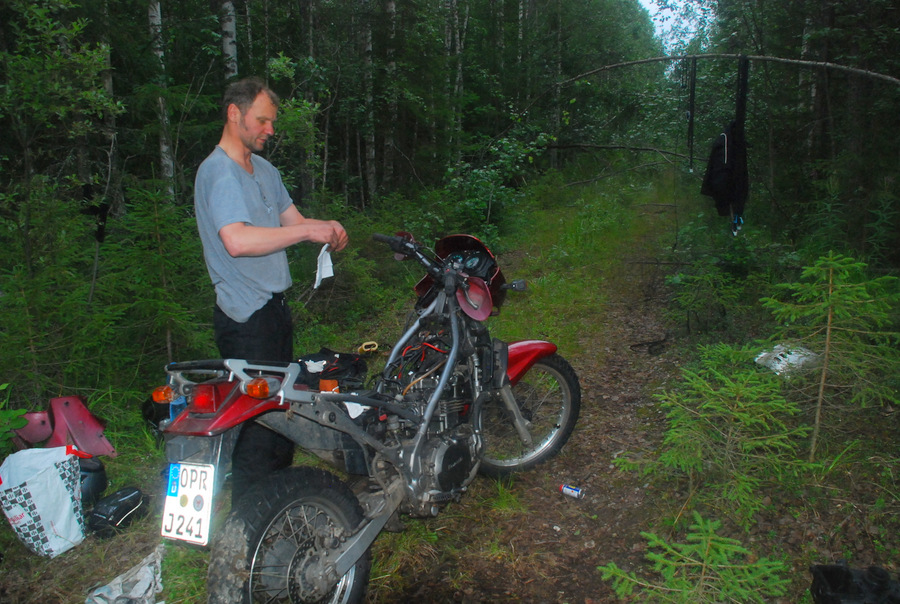 Aber nach EINEM von lumpigen 3 Kilometern machte meine KLE auf einmal Zicken, nahm schlecht Gas an oder mußte hochgedreht werden, um nicht abzusterben. Ich dachte, ich werd´ wahnsinnig! Die eine Kawasaki aus dem Sumpf gerettet und die andere verreckt auf dem kurzen Stück vor der „sicheren“ Asphaltstraße!! Götz fand schnell heraus, daß der Kupplungssignalschalter offenbar was abbekommen hatte und konnte ihn mit einem Stück Draht überbrücken. Aber dennoch lief die Kiste nicht richtig, es stellte sich heraus, daß die Batterie leergesaugt worden war. Da es (mal wieder) schon langsam dunkel wurde, entschieden wir uns nach 3 Nächten in der vollkommenen Einöde ohne sauberes Wasser und wenig mehr als trockenem Brot zum Essen (wie im Knast!) nach Medvezhegorsk zu fahren und morgen die 40km zurückzufahren. Also versteckten wir mein Motorrad wieder in einer anderen Waldschneise in der Nähe der Asphaltstraße.
