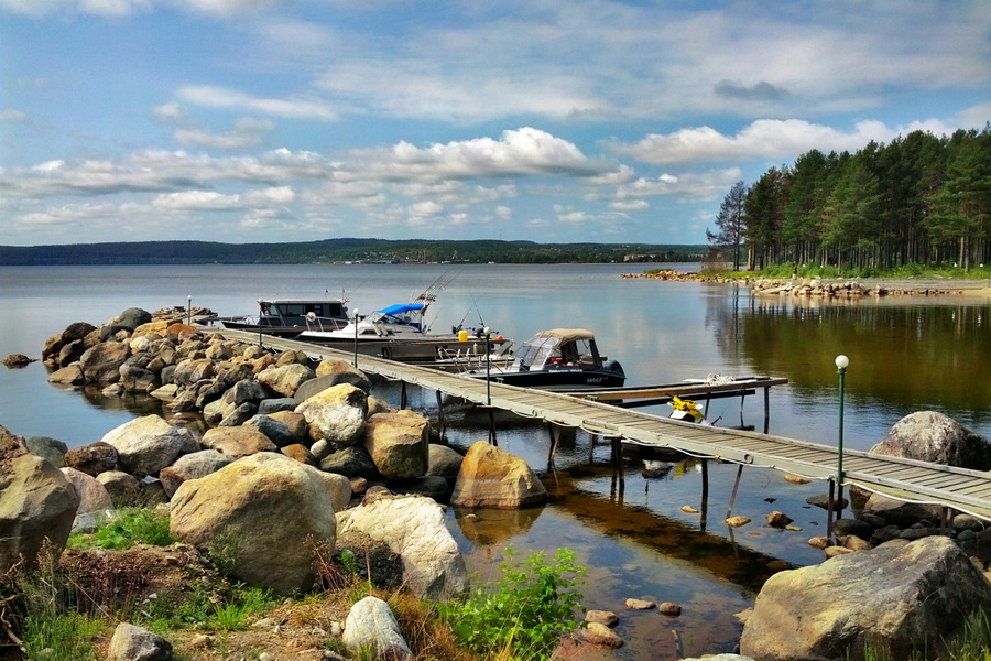 In Medvezhegorsk hatten wir dann (wieder mal) Schwierigkeiten, eine Unterkunft zu finden. Es waren nur 2 Hotels in der gar nicht mal so kleinen Stadt zu finden, das eine war geschlossen, im anderen wurde mir unfreundlich mitgeteilt, man sei voll belegt. Ich hatte aber mehr den Eindruck, „der Motorradfahrer“ war denen nicht geheuer, der Parkplatz des großen Hotels war nämlich fast leer. Aber eigentlich war das ein Glück, denn so kamen wir auf Hinweis an einer Tanke zum Medvezhka Resort (russ.: Bär), einer sehr schönen Anlage aus riesigen Blockhütten direkt am Seeufer. Im Blockhaus ein schönes Zimmer, ein großes Wohnzimmer mit allem Schnickschnack und sogar `ne Waschmaschine. Volltreffer! Und das zog sich auch am nächsten Morgen weiter. Roman, der Chef der Anlage, brachte uns auf die Frage nach einem Batterie-Ladegerät in die Werkstatt des Resorts. Und weil die Motorschlitten, Quads, Mountainbikes, Motorboote, Ski, Schneeschuhe und weiteren Outdoor-Kram vermieteten, war die Werkstatt sehr gut ausgestattete. Aber bald stellte sich heraus, daß meine Batterie hinüber war. Also fuhr uns ein junger Mann, der zum Resort gehörte, in die Stadt zu einem Autozubehör-Laden, wo es zwar wenig Mopped-Akkus gab, aber zumindest eine, die annähernd von Stärke und Spannung paßte. Dann holten wir mein Motorrad aus dem Wald, das sich immerhin durch Anschieben starten ließ, der Auto-Shop hatte mittlerweile zu, also würden wir am nächsten Morgen wiederkommen, um die Batterie zu kaufen, die ich hatte zurücklegen lassen.