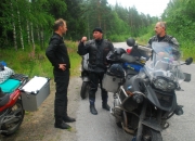 Auf dem Weg zur Motorradabholung wurden wir von einer BMW GS erholt, deren Fahrer eine Rocker-Kutte trug und uns mit seinem Yamaha-fahrenden Kumpel rechts ranwinkte, um mit uns zu quatschen. Die beiden stellten sich als Yevgenyi und Andrej vor, ausweislichlich ihrer Lederkutten (über der topmodernen Schutzkleidung getragen) beide vom „Night Wolves MC“ (Moskau Chapter). Yevgenyi war „der Präsi“, Andrej „Full Member“. Bei den Night Wolves handelt es sich um einen MC, der bereits zu Sowjet-Zeiten aktiv war. Und bei den beiden schien das Motorradfahren auch wirklich eine wichtige Rolle zu spielen, die (sehr rockeruntypische) BMW R 1200 GS von Präsident Yevgenyi war mit allem erdenklichen und nützlichen Touratech-Schnickschnack ausgerüstet. Die beiden kamen gerade von einem Biker-Treffen im polnischen Katyn und waren auf dem Weg nach Murmansk. Sie packten sofort Zigaretten, Twix und ihre Karelien-Karte aus, wollten ganz genau wissen, wo wir herkämen, warum wir zu zweit auf einem Motorrad unterwegs seien, wo wir hinwollten. Eine sehr nette Begegnung in der Pampa.