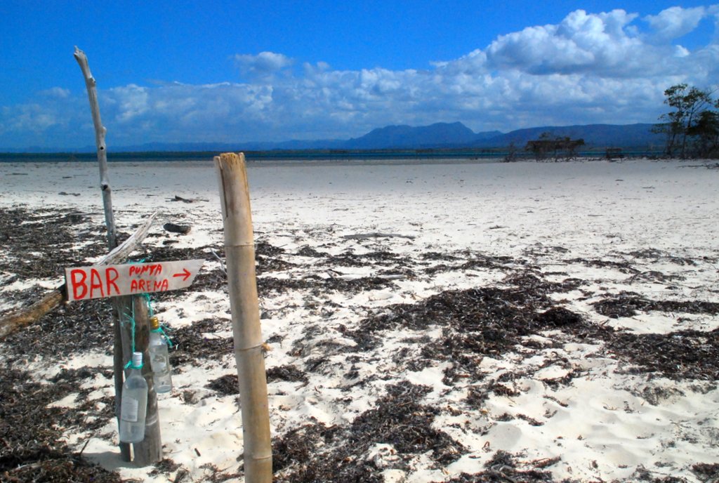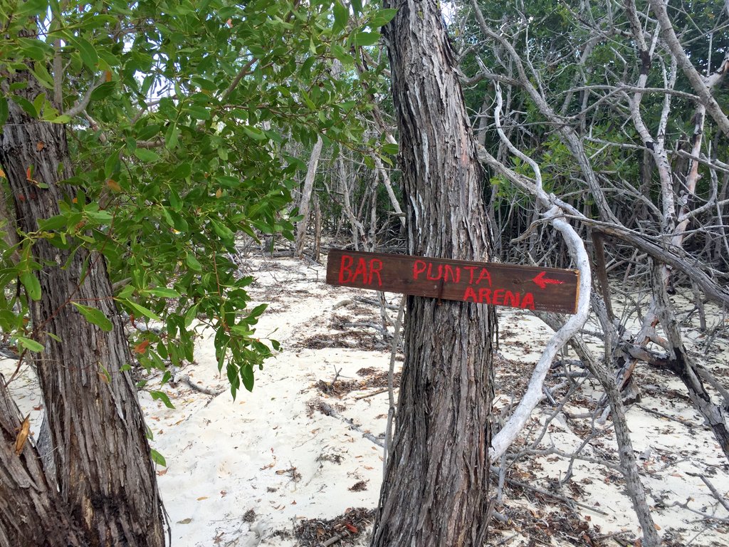 Mitten im Wald standen an dem schmalen Pfad mehrfach Hinweisschilder auf eine „Bar Punta Arena“. Wir dachten, die stammten aus der Zeit vor dem Hurrikan. Aber als wir an der östlichen Spitze der Insel aus dem Wald spazierten, stand da auf einer weiten Sandebene wirklich eine kleiner palmgedeckter Unterstand und darin der wohl einsamste „Barkeeper“ Kubas. Man konnte fast Mitleid mit ihm haben, denn wir hatten den Eindruck, daß sich dort nicht viele Ausflügler hinverirrten. Natürlich mußte dem einsamen Herrn etwas zu trinken abgekauft werden. Es gab 2 Haken: Er hatte nur Bier (in einer Tonne im Sand vergraben) und er konnte auf 20 CUC nicht rausgeben. Also haben wir was getrunken und die restlichen Dosen, die wir für das Geld bekamen, mitgenommen. Allerdings führte die leichte Enthemmung auf dem Rückweg dann nochmal zu 2-3 umgenieteten Bäumchen (verbunden mit heiserem Gekicher).