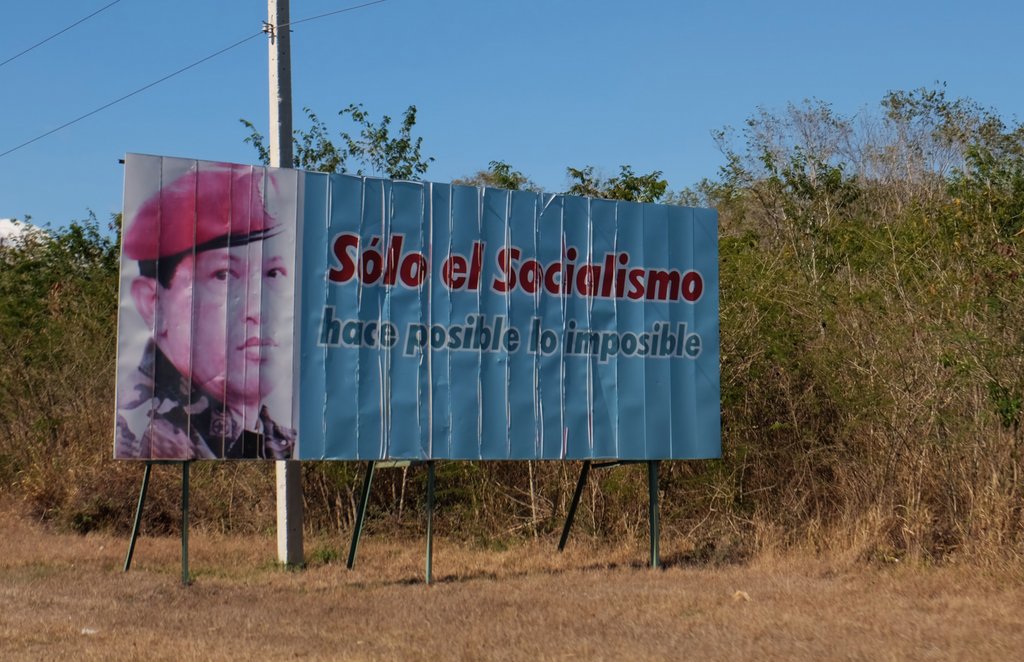Die Fahrt in unserem (mit Fahrer) gemieteten Jeep von Trinidad nach Viñales führte über weite Strecken über die „Carretera Central“, eine Art Autobahn, die fast über die gesamte Länge von Kuba relativ mittig verläuft und die meisten größeren Städte miteinander verbindet. Ich schreibe deswegen „eine Art Autobahn“, weil sie zwar aussieht wie eine Autobahn, aber auch mit Pferdewagen auf dem Standstreifen benutzt wird und Busse an Auffahrten Fahrgäste einsammeln. Da die Autodichte in Kuba sowieso nicht sonderlich hoch ist, hat das einen kuriosen Flair. Entlang der Autobahn stehen in regelmäßigen Abständen große „Billboards“, die die Errungenschaften der Revolution und insbesondere die Völkerfreundschaft zu Venezuela und seinem 2013 verstorbenen Präsidenten Hugo Chavez preisen. Mit Venezuela hat Kuba z.B. ein Programm laufen, das im Gegenzug für günstiges Öl die Versendung von tausenden Ärzten nach Venezuela regelt, auch die Anbindung Kubas an das Internet läuft im wesentlichen über ein einziges Kabel rüber nach Venezuela.