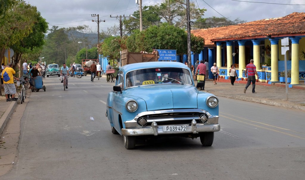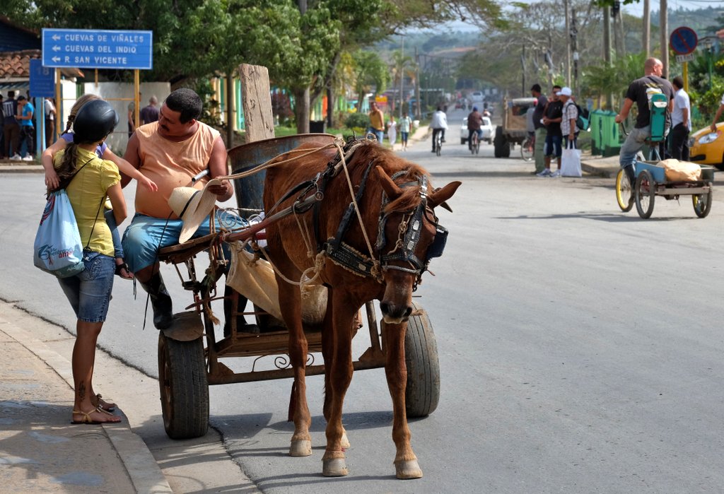Das kleine Städtchen Viñales liegt ganz im Westen von Kuba und ist eine der Hauptattraktionen für Touristen. Das liegt vor allem an der Karstlandschaft um den Ort, steile bewaldete Kalksteinfelsen, die aus relativ flachem Terrain herausragen, den Bergen um Giulin in China oder bestimmten Gegenden in Thailand, Vietnam oder Laos nicht ganz unähnlich. Was hier aber einzigartig ist, ist der rote Lehmboden, der sich anscheinend perfekt für den Tabakanbau eignet, denn aus dieser Gegend kommt ein beträchtlicher Teil des Rohstoffs der Zigarren, für die Kuba so berühmt ist. Die Stadt selbst ist sehr unaufgeregt, auf der Hauptstraße kann man ganz entspannt flanieren oder in einem der Cafés oder Restaurants auf der Terrasse abhängen und dem moderaten Treiben zusehen. Hier fanden wir Kuba besonders „urig“, die wenigen Autos auf den Straßen sind fast ausnahmslos amerikanische Straßenkreuzer aus den 50ern, dazwischen gibt´s aber auch immer mal wieder Pferde oder Pferdefuhrwerke.