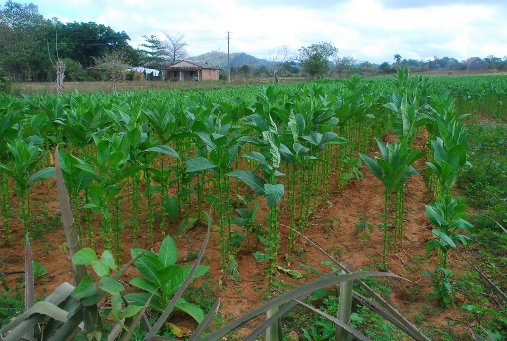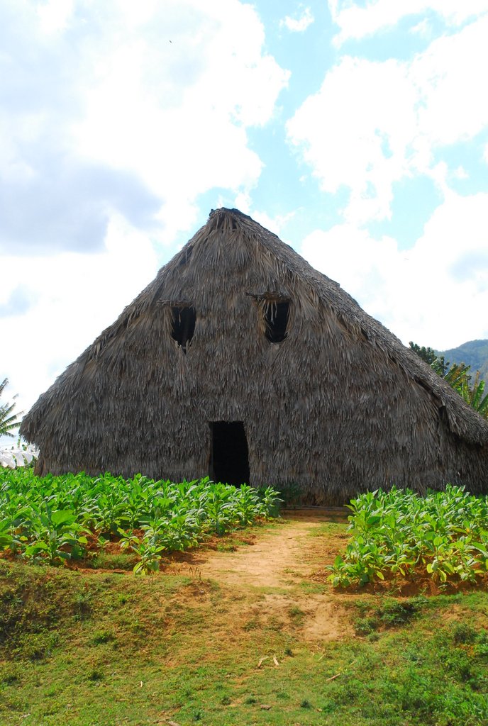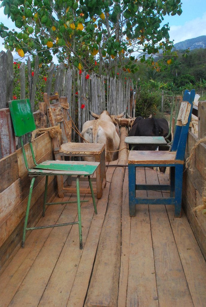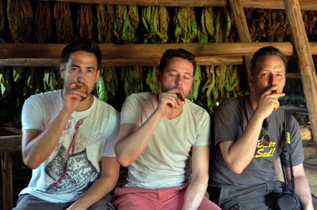 Am nächsten Tag machten wir das, was jeder Tourist in Viñales macht: Eine Tour durch´s Gelände zu den Tabakplantagen, den Bergen und ein oder zwei Höhlen, von denen es im Karst viele gibt. Man hat die Wahl zwischen Reiten auf Pferden oder einem Ochsenkarren. Wir wissen heute nicht mehr so genau warum, aber wir haben uns für den Ochsenkarren entschieden. Unser Kutscher, ein vergnügter älterer Herr (Name leider vergessen) zuckelte mit uns durch die Pampa, ab und zu ging es durch geflutete Trassen oder richtige ordentliche Spurrillen, dabei mußte er die relativ faulen Ochsen permanent mit irgendwelchen Lauten oder durch Pieksen mit der Rute antreiben. Die Laute waren so eingängig, daß wir stellenweise das Antreiben selbst übernommen haben. :-) Auf der Tour machten wir den obligatorischen Stop bei einer kleinen Tabakplantage, uns wurde der Herstellungsprozeß erklärt (u.a.: Der Tabak wird nach dem Trocknen kurze Zeit fermentiert. Wieder was gelernt!). Natürlich gab es gleich auch eine Verkostung und die Möglichkeit, beim Farmer selbst einzukaufen, was Philipp und Jörg auch nutzten. Das ganze war jetzt keine „Heizdecken-Kommerzveranstaltung“, sondern erfrischend wenig professionell.