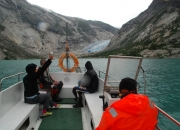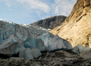 Da wir mal wieder ein bißchen spät dran waren, nahmen wir auf dem Hinweg zum Gletscher Nigardsbreen ein kleines Boot. Hier war es genau andersrum als am Engenbreen: Bei der Annäherung war es grau und kühl, kaum waren wir am Gletscher angekommen, kam die Sonne raus, was für das Farbenspiel des Eises natürlich deutlich schöner ist. Für diejenigen unter den Lesern, die sich fragen, warum das Eis an manchen Stellen so tief blau schimmert: Das liegt am Alter des Eises bzw. dem Druck. Oben auf dem Eisfeld fällt mit der immer mehr Schnee auf den Gletscher, der ältere, untere Schnee wird komprimiert und wird zu Eis. Und komprimiertes Eis filtert dann bestimmte Wellenlängen des Lichts heraus wie bei einem Prisma. Et voilá: Es leuchtet blau! (Insider!). Der Nigardsbreen ist m.E. noch beeindruckender als der Engenbreen im Norden (s. letzte Seite), weil man direkt an das Gletschertor und den wirklich spektakulär reißenden Fluss herankommt und er landschaftlich auch schöner liegt.
