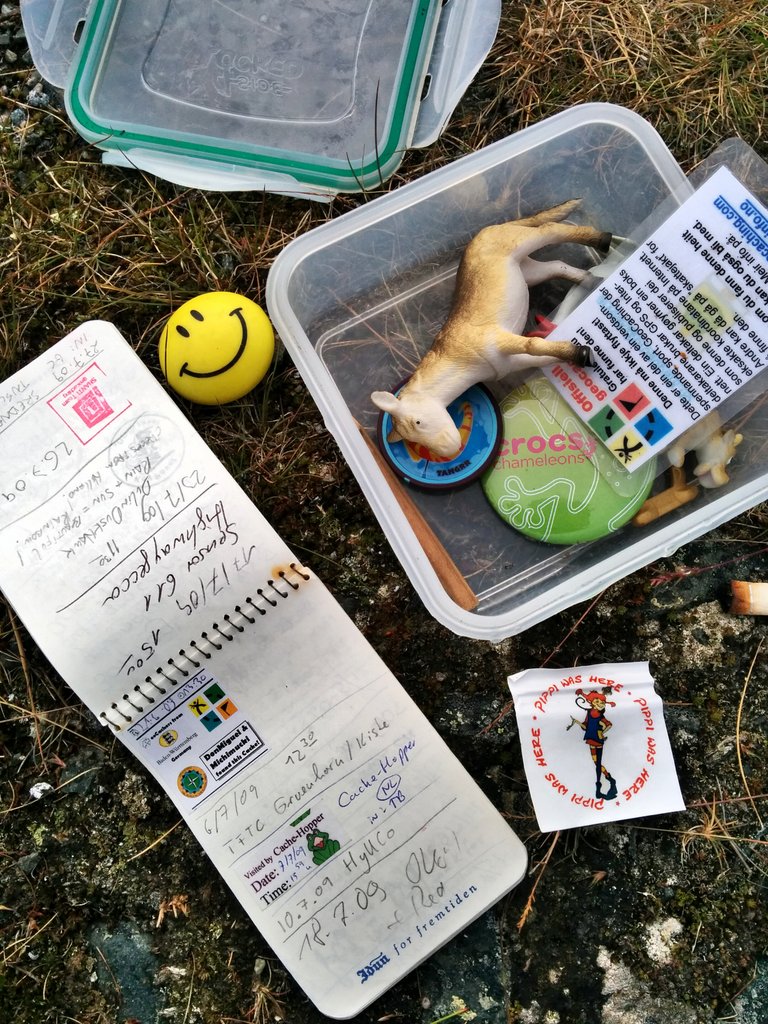 Simone fand dann noch bei den Felsen neben unserem Zelt eine Tupper-Dose, die offenbar ein Geo-Cacher dort versteckt hatte. Ganz ohne GPS gefunden, auch kurios.