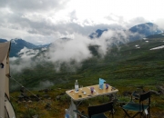 Für den nächsten Morgen stand die Fahrt über die berühmte Sognefjell-Straße an, in dieser Gegend waren die Unterkünfte ziemlich dünn gesäht. Also suchten wir uns kurz vor dem Beginn des Sognefjells an einer gut ausgebauten Seitenstraße einen Spot zum Wildcampen. Auf diese Idee waren aber schon ein paar andere gekommen, jede größere plane Fläche war schon mit einem Zelt oder Campingbus besetzt, als wir rauffuhren. In Norwegen gilt, wie überall in Skandinavien, das „Jedermannsrecht“. Das bedeutet, daß Camping überall erlaubt ist, solange man nicht näher als 150m am nächsten Haus ist, es explizit an dieser Stelle verboten ist oder man sich auf privatem Grund befindet. Aber fast ganz oben auf dem Berg fanden wir noch eine wunderbare Stelle für uns Zelt und das Auto. Klapptisch raus, Feierabendbier, kochen und in der Abenddämmerung die wunderbare Aussicht genießen, perfekt!