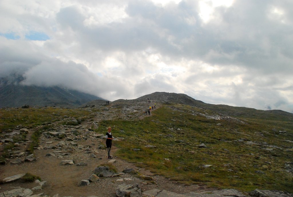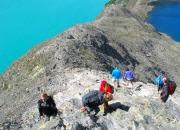 Auf dem kurze restlichen Stück bis zum Gipfel Veslefjellet gibt es dann keinen Grat mehr, sondern eine breite Ebene aus Geröll (eben „Fjellet“). Auf diesem Stück überholte uns zum wiederholten Male eine Dame um die 60, deren linkes Bein über dem Knie amputiert war und in einer Hightech-Prothese steckte, was man wegen ihrer kurzen Wanderhosen ohne weiteres erkennen konnte. An den wirklich steilen Stellen ließ sie sich von ihrem Hund mit einer Art Geschirr zur Unterstützung bergauf ziehen. Diese Dame war dermaßen zäh und schnell, wir waren beeindruckt. Der Abstieg bis zum Parkplatz in Gjendesheim nahm dann nochmal ca. 2h in Anspruch, auch hier waren überraschenderweise ein paar wirklich haarige Stellen dabei. Die Tour ist wirklich uneingeschränkt zu empfehlen, für uns war sie der krönende Abschluß dieser grandiosen Reise!