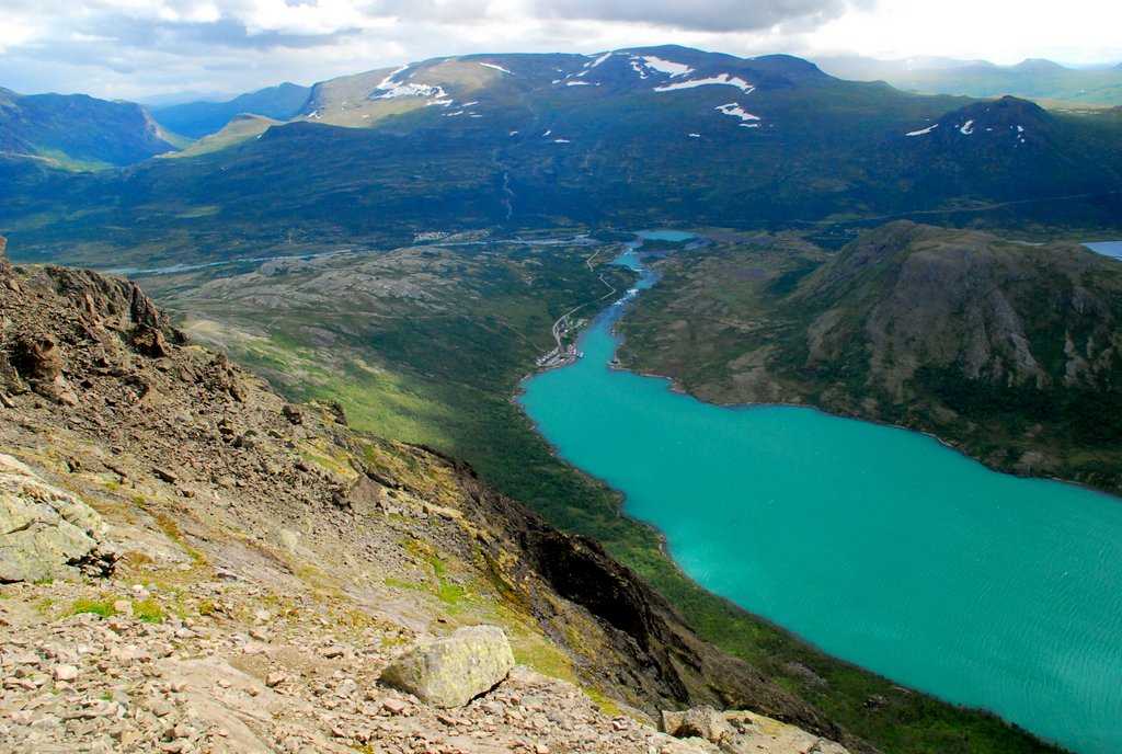 Langsam wurde die weitere Route (vermeintlich) erkennbar, wir liefen immerhin schon auf einem Bergrücken. Nach ca. 2h erreichten wir einen ersten, kleineren Gipfel mit ca. 1.500m Höhe, von da aus ging es erst einmal wieder leicht hinab. Ab hier konnte man auch die namensgebende „Schlüsselstelle“ der Besseggen-Wanderung sehen: Den schmalen Grat, der den (links im Bild gelegenen) blauen Bessvatnet vom smaragdfarbenen Gjende-See (rechts) trennt. Es wirkt so, als lägen die beiden Seen ganz dicht beieinander, tatsächlich trennen sie aber rund 400 Höhenmeter.