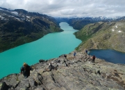 Für den drittletzten Tag unserer Reise hatten wir die berühmteste Route Norwegens auf dem Programm, die Wanderung über den Besseggen-Grat. Etwa 30.000 Menschen laufen diese Strecke im Jahr. Die Tour ist ca. 14km lang und dauert ca. 5-6h, es geht insgesamt knapp 1.100 Höhenmeter bergauf. Der erste Teil ist aber ganz entspannt, man fährt mit dem Boot zum anderen Ende des Gjende-Sees zur Memurubu-Hütte auf ca. 950m Höhe und marschiert los (am besten, nachdem man ein paar Minuten gewartet hat, denn die meisten rennen vom Anleger los als gäbe es kein Morgen). Zunächst geht es recht harmlos auf einem gut ausgebauten Weg bergan, dann läuft man auf einem felsigen Pfad. Hier dünnte sich die Meute der Wanderer schon aus, die Familien mit kleinen Kindern überholten wir schnell. Aber so richtig einsam ist der Besseggen natürlich nie. Netterweise wechseln auf diesem ersten Abschnitt steile Anstiege und moderate Passagen ab, so daß man den Blick auf den Gjende-See und die Gipfel des Jotunheimen werfen kann.